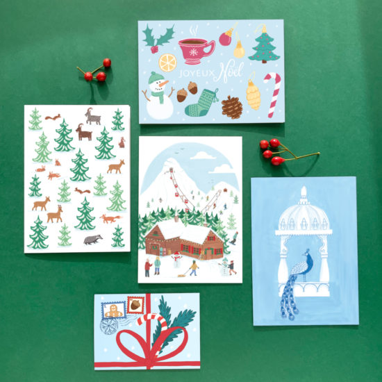 Hand drawn and printed on a textured paper. With a white enveloppe.