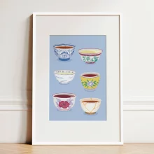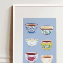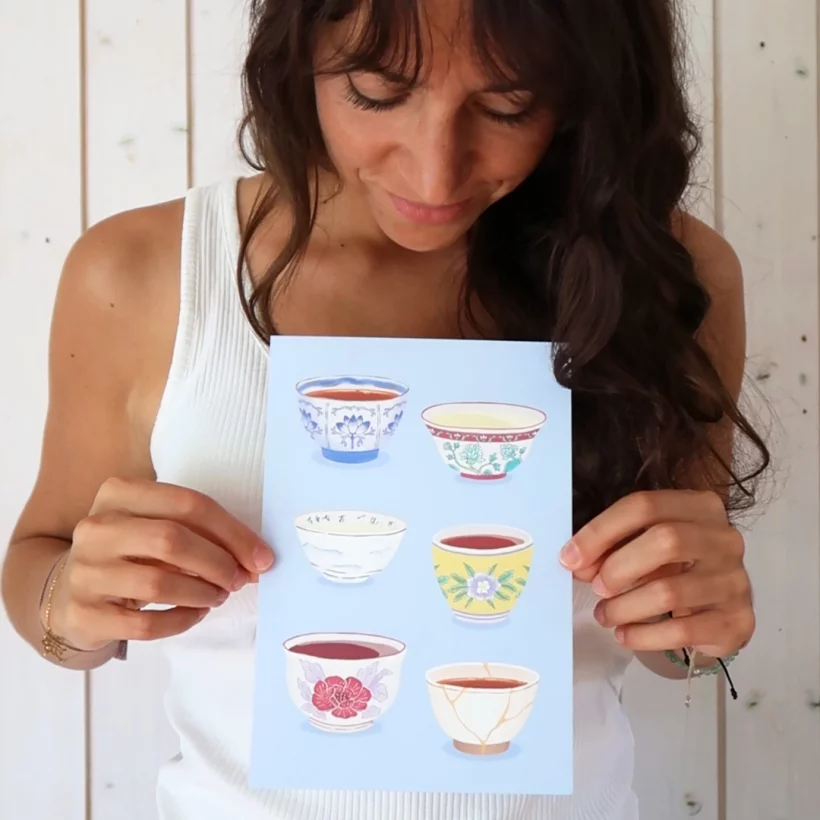 Pour les amoureux de thés. Ces petites tasses à thé sont inspirées de mes voyages au Japon et de ma passion pour la céramique japonaise. Dessiné à la main et imprimé sur un papier texturé. Sans cadre.